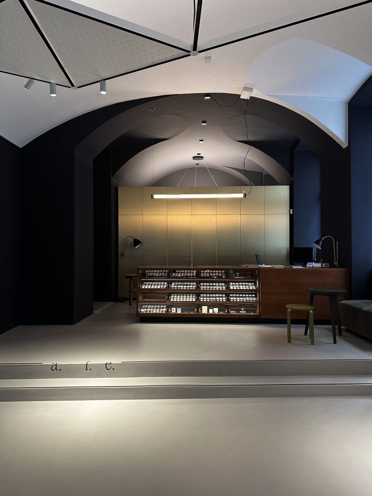 Das Zusammenspiel von Hell und Dunkel haben wir im Projekt aufgenommen und die Galerie in eine dunkle Farbe getaucht. Der Kontrast zu hellen Elementen spielt sich am Boden und an der Decke ab. Eine Sonderanfertigung und das Herz der Galerie ist eine Messing Wand die den Verkaufsraum vom Lager trennt und strahlendes Licht einbringt.