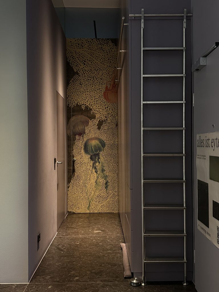 Die Gäste Toilette / Powder Room spielt mit dem Thema Dämmerung. Hier taucht man in einen exotischen Wald ein, wo Vogelgezwitscher Ruhe reinbringt.