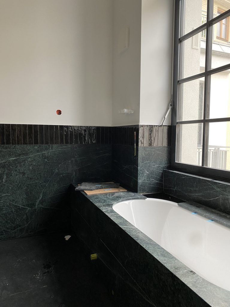 Das Hauptbadezimmer dominiert in den Farben dunkelgrün und schwarz und hat als Besonderheit eine Badewanne mit Ausblick nach draußen. Große Natursteinplatten machen …