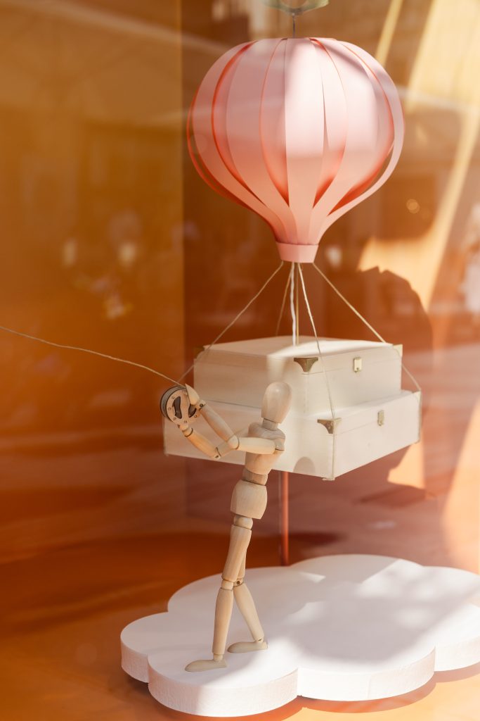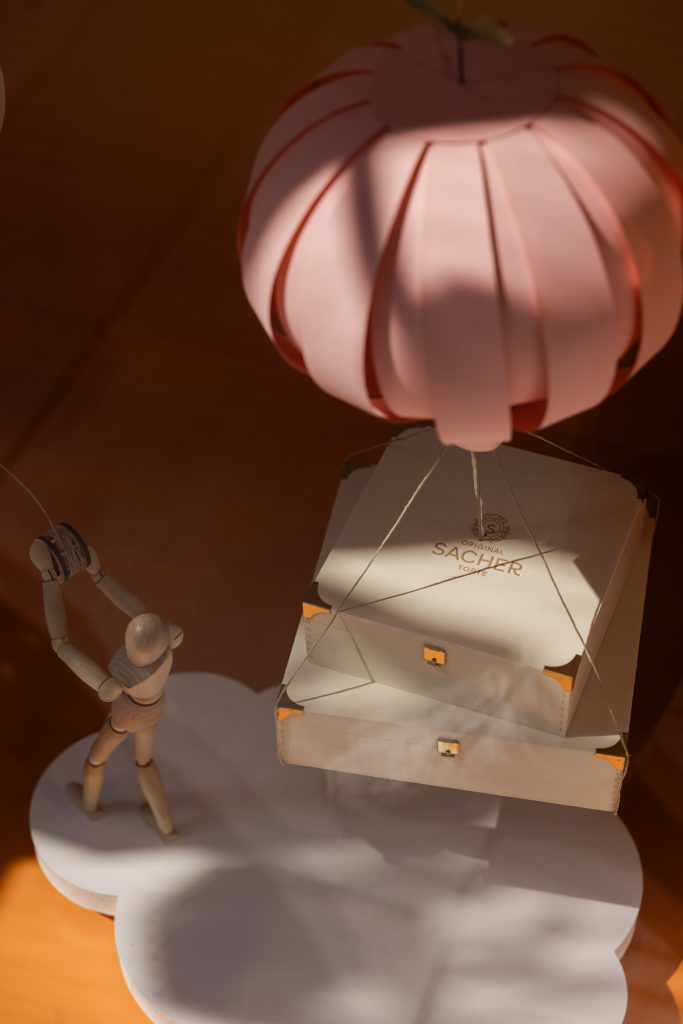 Das Sacher Hotel hat bereits zur Kaiserzeit ihre weltberühmte Sachertorte ausliefern lassen. Anna Sacher war schon immer ihrer Zeit voraus. Deshalb haben wir dieses Thema in unsere Herbst Schaufenster Installation verspielt verpackt.
